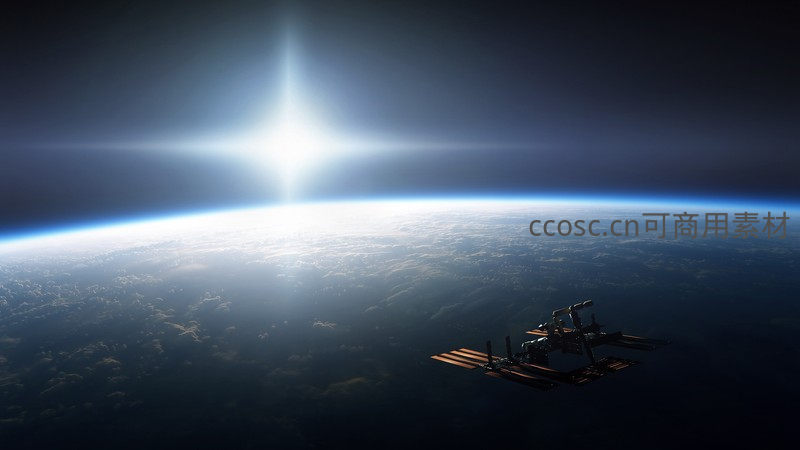 国际空间站飞越地球晨昏线,耀眼阳光洒向云层,象征人类对宇宙的不懈探索与科技进步。