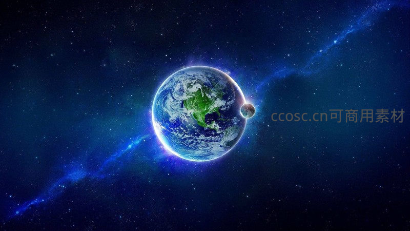 蔚蓝的地球悬浮于深邃宇宙中,月球静静相伴,星光与光晕交织出宁静而神秘的天体画卷。