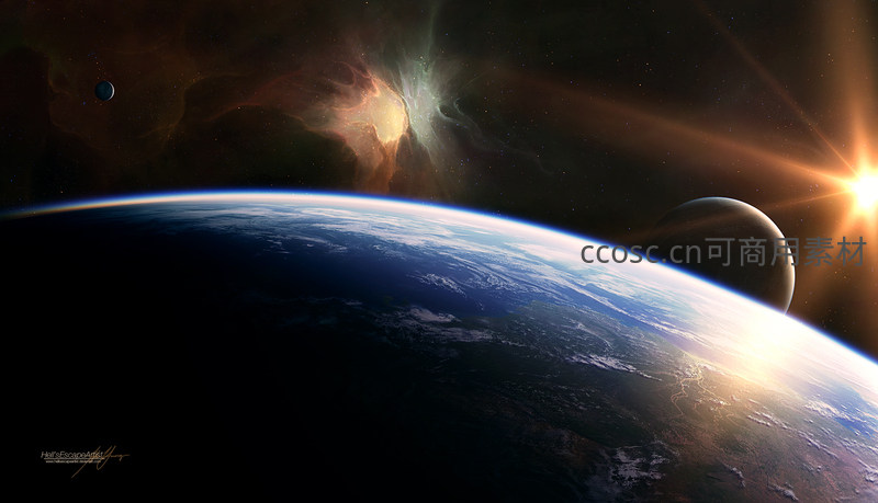 从太空视角俯瞰地球,蔚蓝的星球弧线与绚烂的星云、耀眼的恒星光芒交相辉映,营造出壮丽而神秘的宇宙景象。