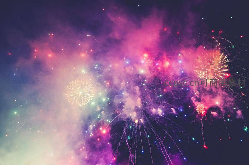 绚丽多彩的烟花在深邃夜空中盛放,如梦似幻的光点与烟雾交织,营造出盛大而浪漫的节日氛围。