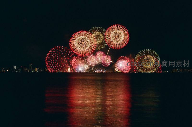 绚丽的烟花在城市上空绽放,其璀璨的光芒完美倒映在平静的水面上,形成上下对称的梦幻景象。