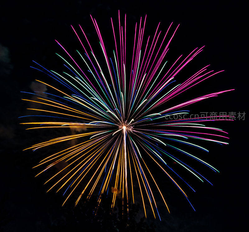 一朵由红、黄、蓝、绿等多种颜色组成的彩虹烟花在夜空中盛开,如同一个巨大的彩色光球,奇幻而迷人。