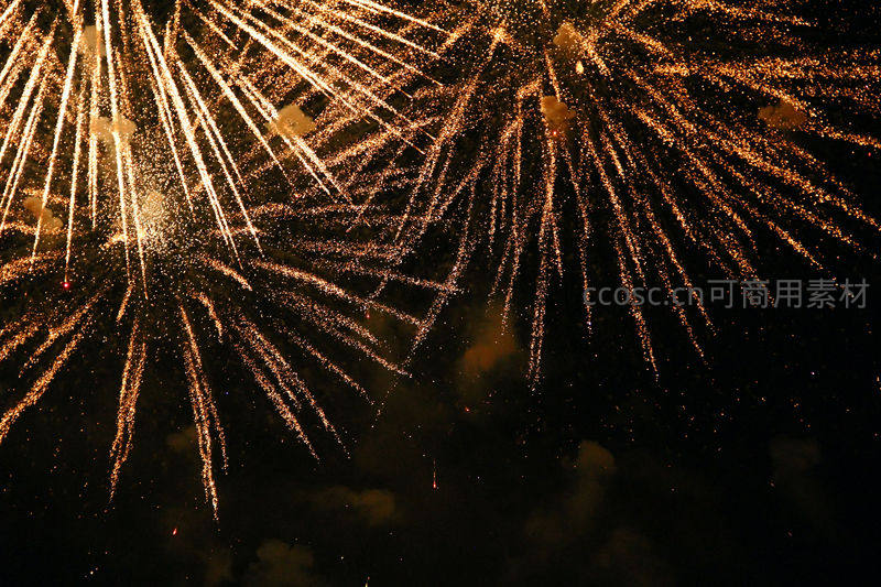 深邃夜幕下,金色烟花如流星般划破长空,瞬间绽放出万丈光芒,照亮了整个天际,营造出盛大而热烈的节日氛围。