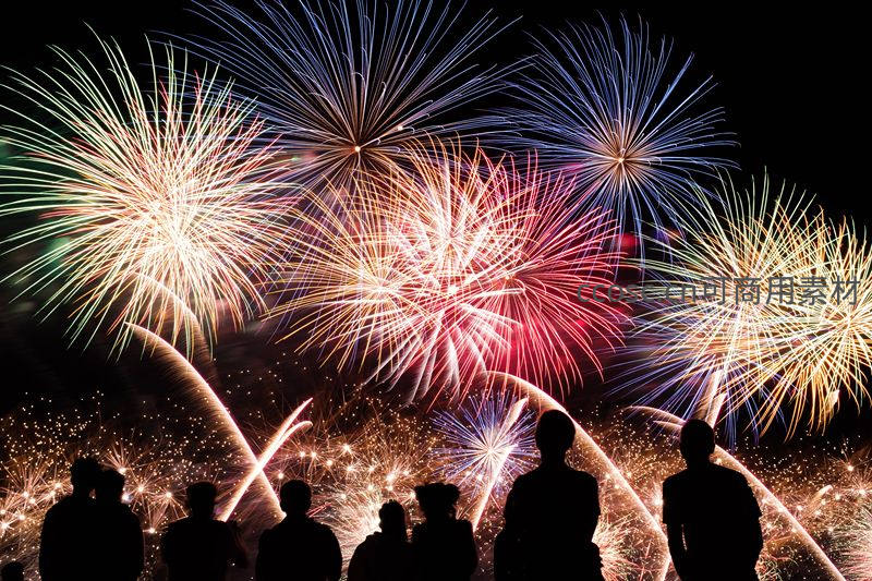 在璀璨夺目的烟花秀下,人们驻足仰望,他们的剪影映衬着绚烂的天空,共同分享着节日庆典带来的喜悦与感动。