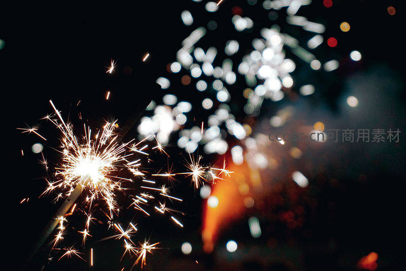 前景中清晰的仙女棒火花与背景里虚化的烟花交相辉映,利用景深创造出梦幻般的层次感,渲染出浓厚的节日浪漫氛围。