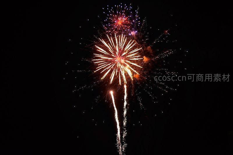 一朵巨大的金色烟花在无垠的黑色夜幕中轰然绽放,光芒四射,如同夜空中的太阳,带来无尽的喜庆与辉煌。