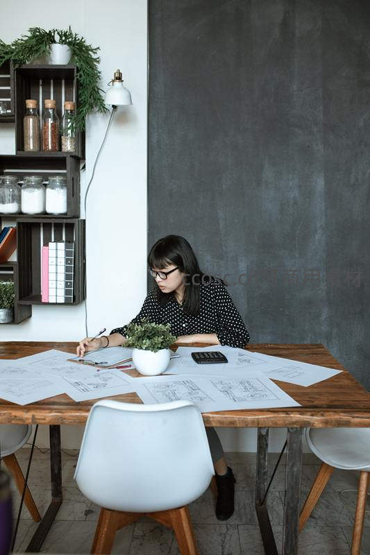 一位戴眼镜的女性设计师坐在木质办公桌前,专注地绘制设计图纸,桌上摆放着绿植和文具,环境简约而富有创意。