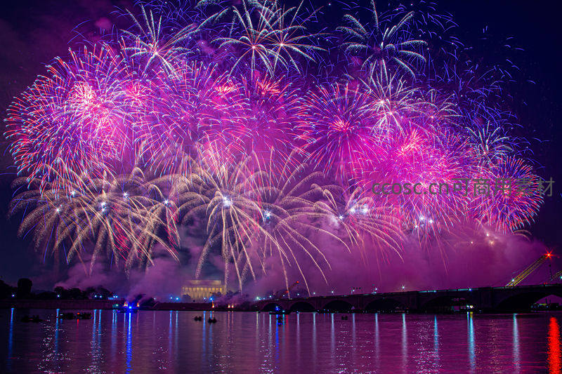 一场盛大的烟花汇演在河畔上空上演,绚烂的紫蓝光芒映照在波光粼粼的水面上,与远处的桥梁和建筑共同构成壮丽夜景。