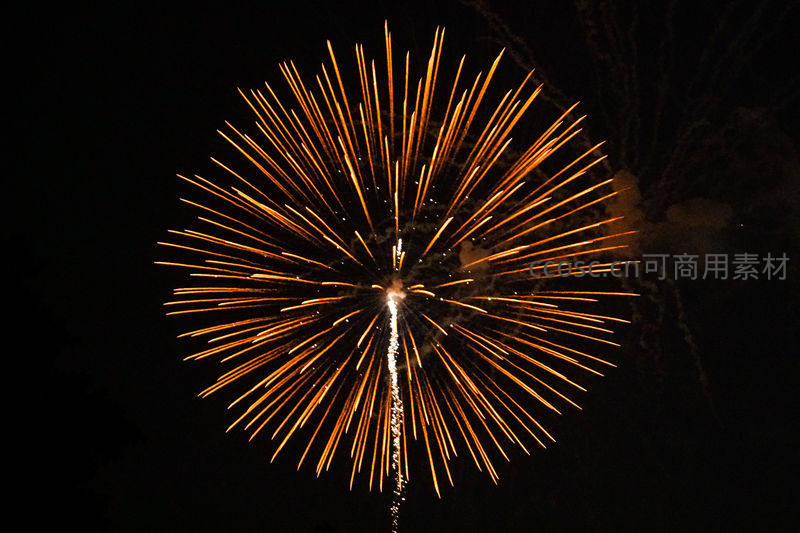一朵完美的橙色烟花在漆黑背景中瞬间盛开,放射状的光束如同太阳般耀眼,充满力量与美感。
