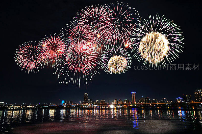 城市上空绚丽烟花绽放,倒影如画