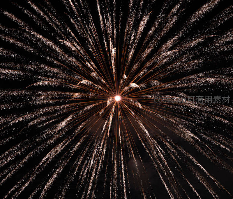 一朵巨大的金色烟花在漆黑的夜空中瞬间绽放,光芒四射,如同宇宙爆炸般震撼人心,留下绚烂的轨迹。