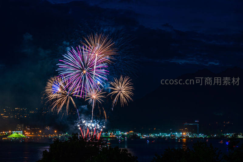 绚丽的紫红色烟花在港湾上空绽放,与城市灯火和远山轮廓交相辉映,水面倒影让整个场景更显梦幻迷人。