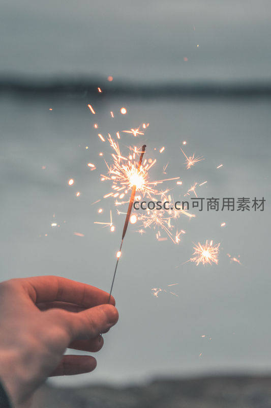 一只温柔的手轻握着燃烧的烟花棒,背景是朦胧的水面与暮色天空,光点飞舞,传递着节日的喜悦与宁静。