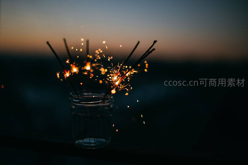 几支烟花棒插在透明玻璃罐中,在黄昏时分闪烁着温暖光斑,营造出静谧而梦幻的节日装饰氛围。