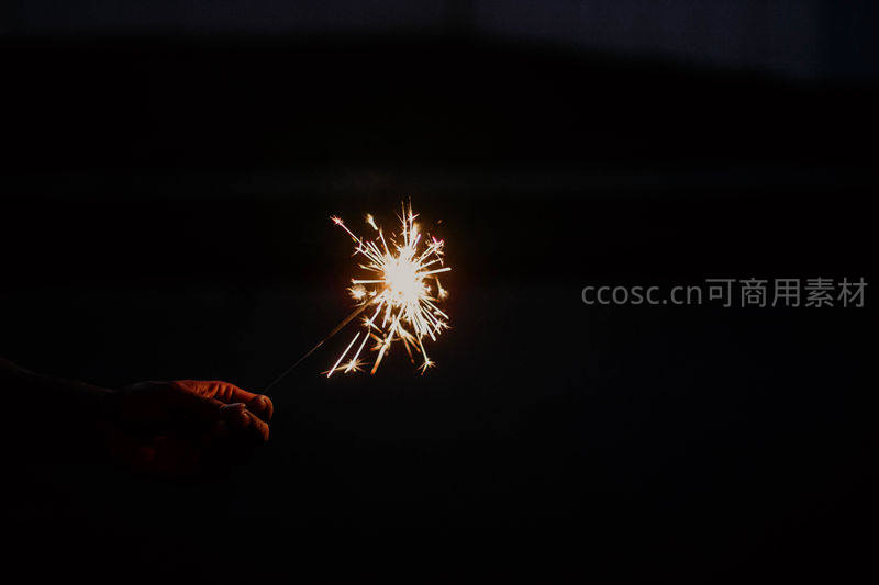 一只手掌在漆黑背景中稳稳握着燃烧的仙女棒,明亮的火花向四周迸发,营造出温馨而神秘的节日感。