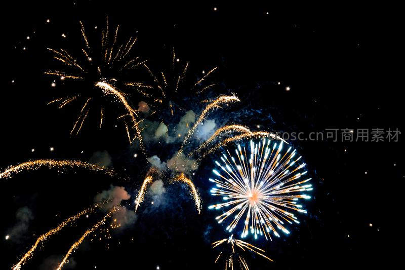 深蓝夜空点缀着点点繁星,多簇烟花在此背景下同时绽放,蓝白与金黄交相辉映,营造出奇幻的视觉盛宴。