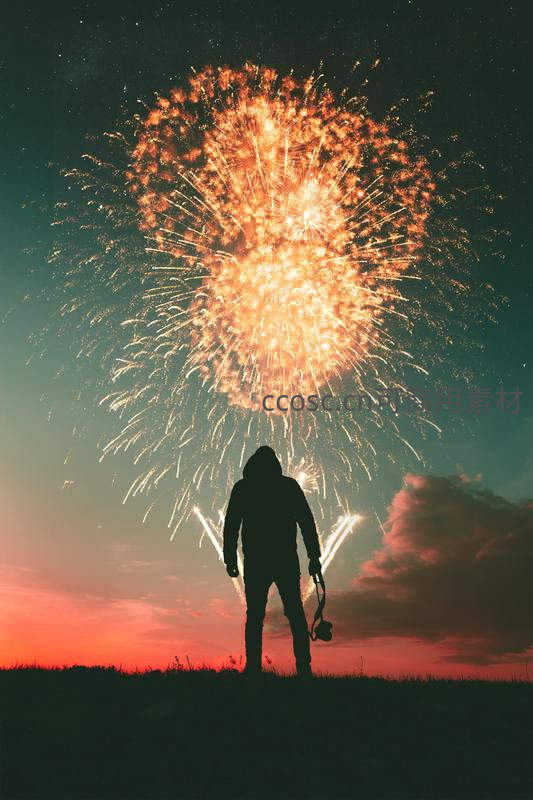 一个人的剪影伫立在草地上,仰望着头顶绚烂的烟花与繁星点点的夜空,画面充满诗意与宁静的浪漫氛围。