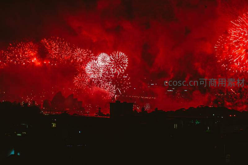 整片夜空被浓烈的红色烟花覆盖,悉尼歌剧院轮廓在火光中若隐若现,展现世界级都市庆典的恢弘气势。