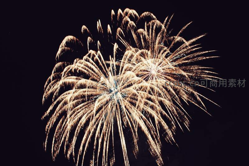 一朵巨大的金色烟花在漆黑夜空中完全绽放,如同盛开的菊花,光芒四射,令人叹为观止。