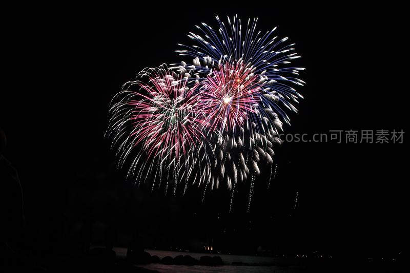 红、白、蓝三色烟花在夜空中同时绽放,色彩鲜明,象征着庆典或爱国主题,视觉效果震撼。