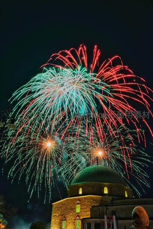 绚丽多彩的烟花在古老圆顶建筑上空盛大绽放,红绿光芒交织,照亮了宁静的夜空与庄严的寺庙轮廓。