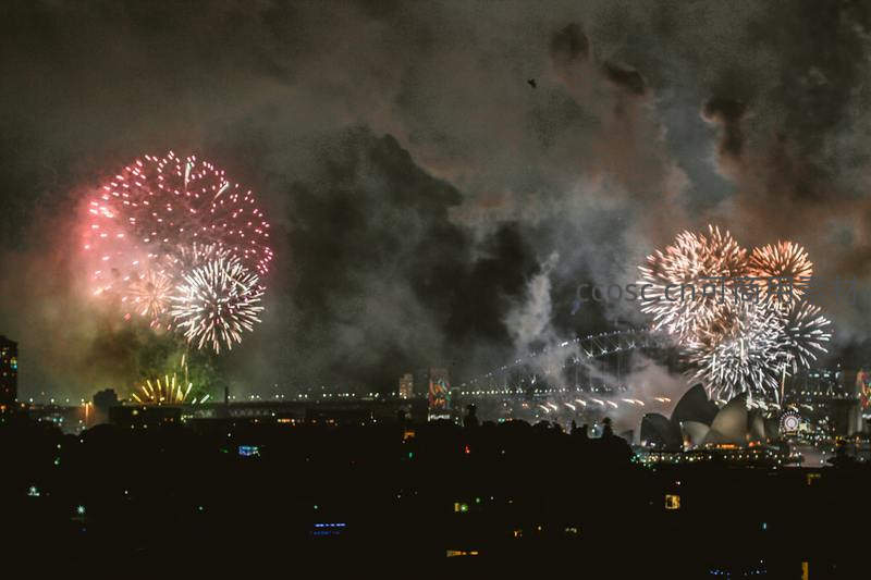 悉尼歌剧院和海港大桥在绚烂的烟花映衬下熠熠生辉,浓密的烟雾弥漫在夜空,记录下全球闻名的跨年庆典盛况。