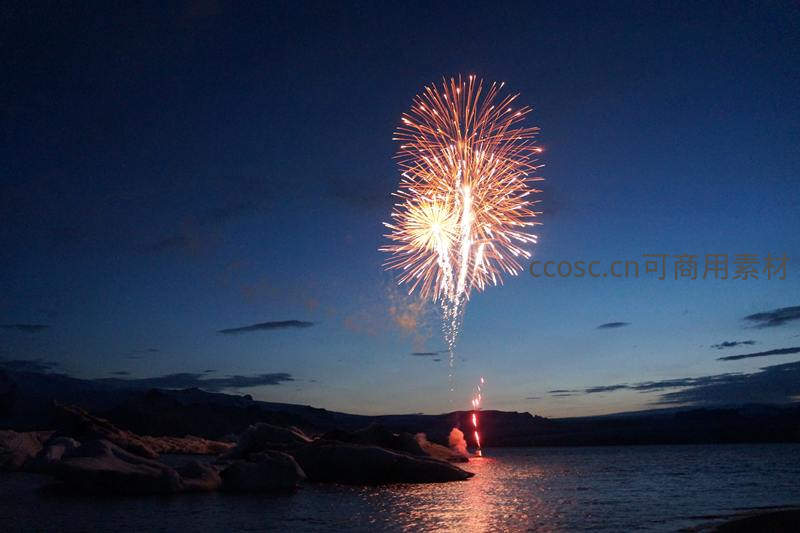 一束烟花在寂静的冰湖上空独自绽放,其光芒在水面投下长长的倒影,与远处的雪山和深蓝夜空构成一幅宁静而壮美的画卷。