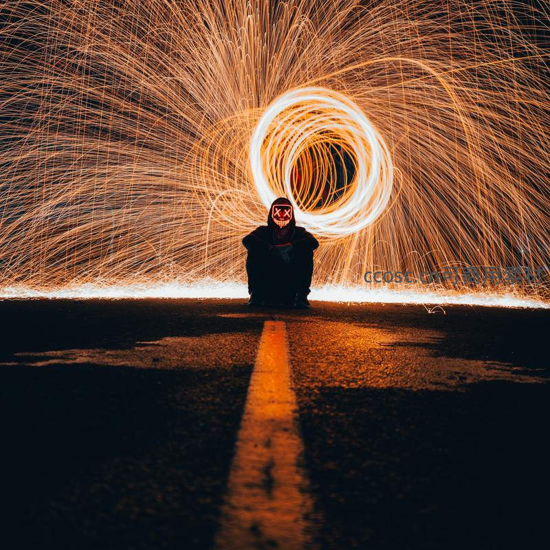 一人蹲坐于公路中央,身后是钢丝棉旋转形成的巨大光圈与放射状火花,充满神秘与艺术感。