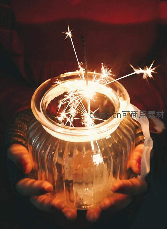 一双温暖的手捧着透明玻璃罐,罐内烟花棒绽放出璀璨光芒,营造出温馨浪漫的节日氛围。