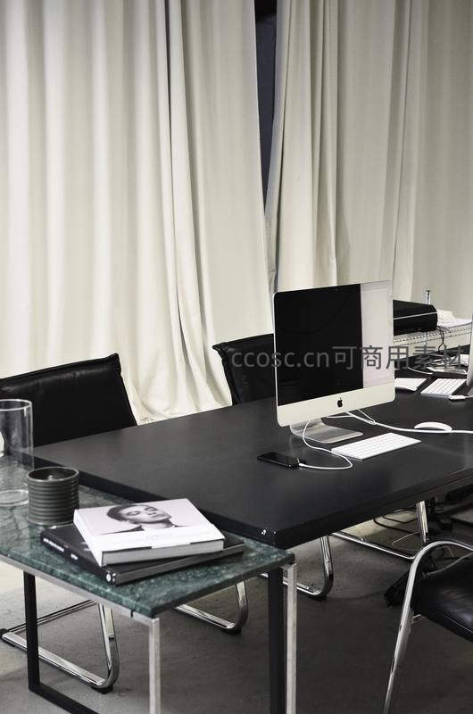 一张干净整洁的黑色办公桌,搭配白色iMac和几本杂志,背景是柔和的米色窗帘,尽显现代极简美学。