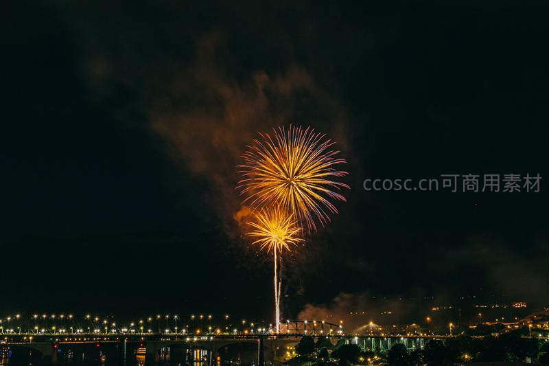城市上空的金色烟花盛放