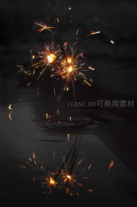 几支点燃的烟花棒在黑暗中闪耀,其明亮的火花和倒影在平静的水面上轻轻荡漾,营造出静谧而浪漫的氛围。
