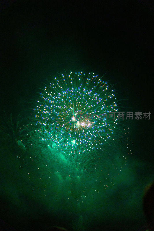 翠绿烟花如繁星般散开,在夜空中留下梦幻般的绿色光晕