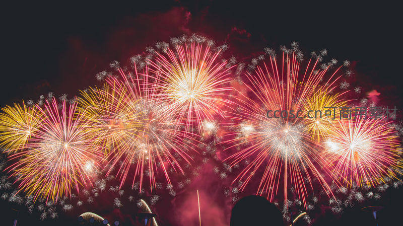 绚丽多彩的烟花在深邃夜空中盛放,如花朵般绽开,照亮了城市与水面,营造出梦幻般的节日氛围。
