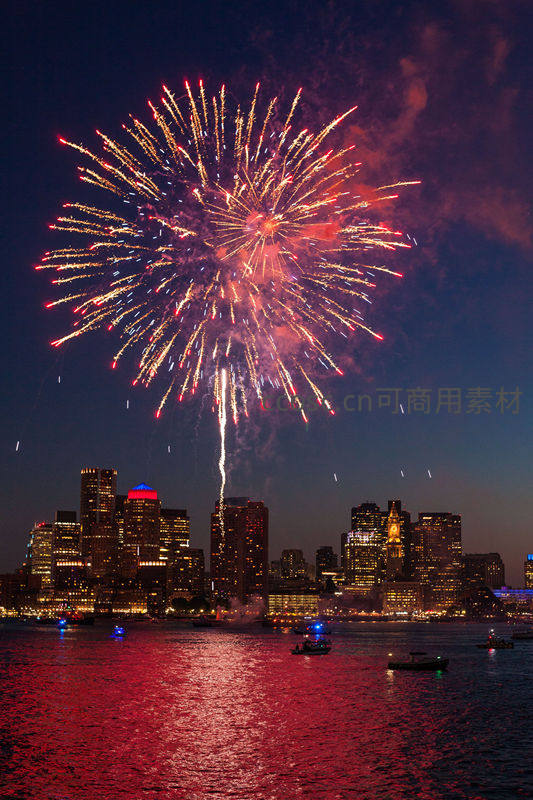 绚丽的烟花在灯火辉煌的城市上空盛放,其光芒倒映在平静的水面上,与摩天大楼的轮廓交相辉映,构成一幅壮丽的都市夜景画卷。