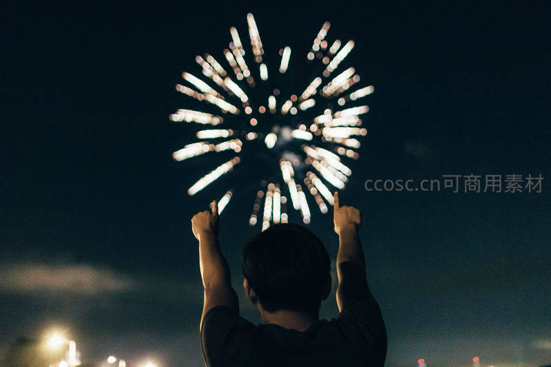 夜空烟花绽放,人影举手欢呼