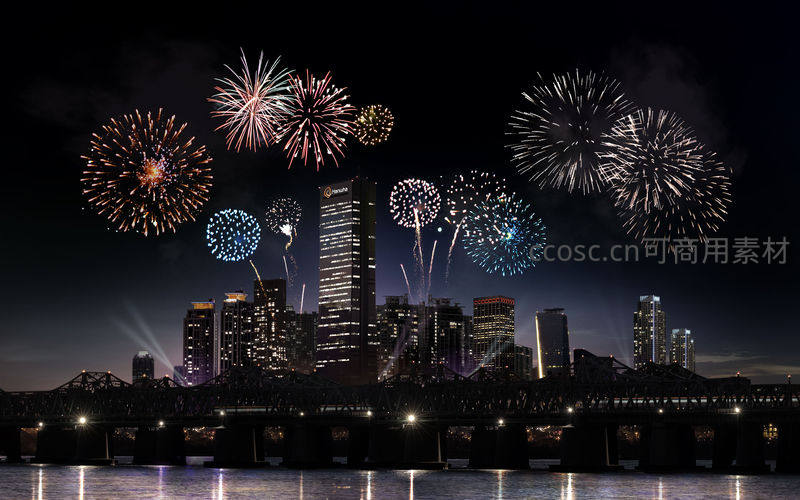 繁华都市夜空被绚烂烟花点亮,高楼林立、桥梁横跨水面,展现现代都市的节日盛况。