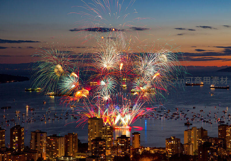 黄昏时分,绚丽多彩的烟花在繁华都市的海港上空盛大绽放,映照着灯火通明的摩天大楼和水面上的点点船影,展现出一派热闹非凡的节日景象。