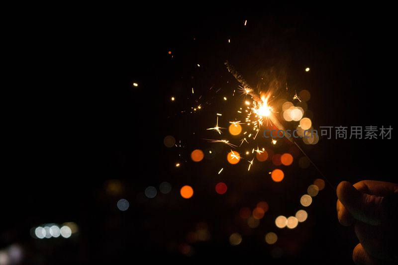 一只手紧握着正在燃烧的仙女棒,迸发出温暖明亮的火花,背景是模糊的城市灯光,营造出一种温馨、浪漫且充满节日气息的亲密氛围。