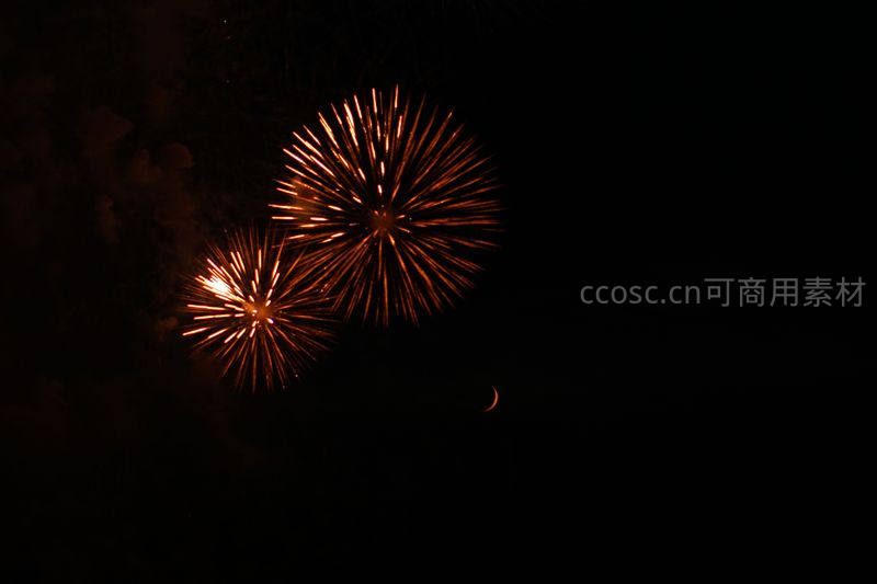 双星烟花与新月同框,夜空静谧而浪漫