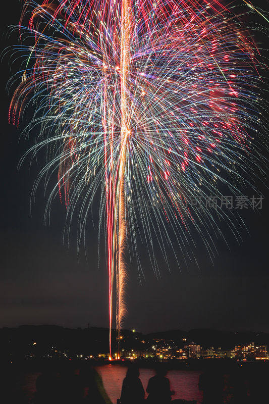 巨大的彩色烟花在城市水岸边的夜空中炸开,其光芒映照在水面上,与远处灯火通明的城市剪影交相辉映,构成一幅壮丽画卷。
