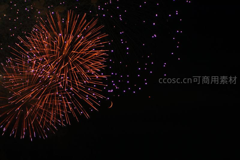 在无垠的黑色天幕中,一簇橙红色的烟花与一弯新月静静相伴,点缀着几颗淡紫色的星点,营造出静谧而浪漫的节日夜空。