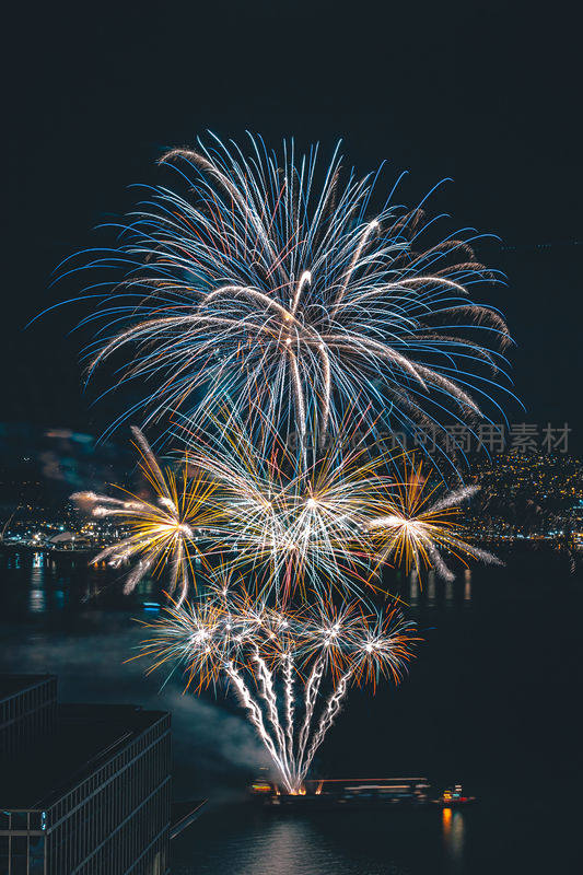 绚丽的烟花在港口上空绽放,其光芒洒落在水面和远处的城市建筑群上,一艘船只静静停泊,共同构成了一幅繁华的都市节日夜景。
