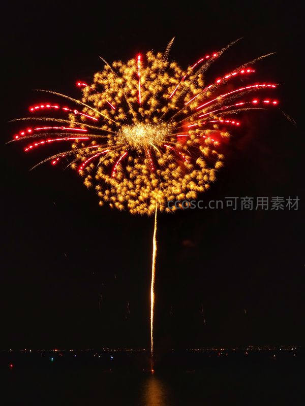 一朵巨大的金色菊花状烟花在夜空中完美绽放,边缘点缀着鲜红的火花,其耀眼的光芒穿透黑暗,为节日夜晚增添了极致的华丽感。