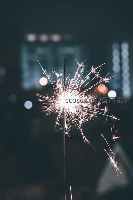 一支正在燃烧的仙女棒在前景中闪耀,背景是模糊的城市灯光,营造出温馨浪漫的节日氛围,捕捉了庆祝时刻的细腻与美好。