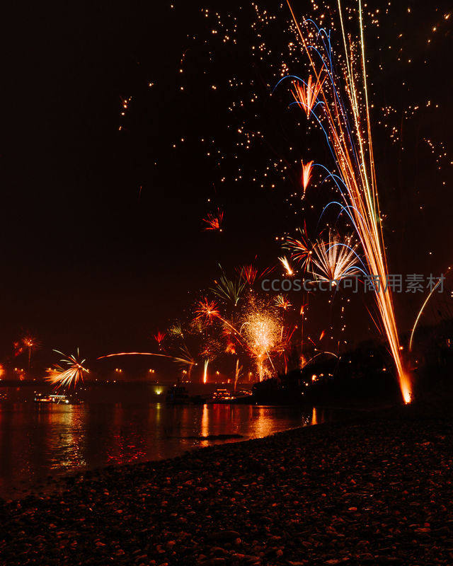从岸边仰望,五彩缤纷的烟花划破夜空,橙色与蓝色的光轨交织,火花四溅,照亮了河面与岸滩,带来一场令人震撼的视觉与感官盛宴。