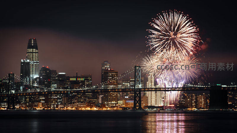 绚丽的烟花在城市上空绽放,照亮了灯火通明的摩天大楼和跨海大桥,水面倒映着斑斓光影,营造出盛大而梦幻的节日氛围。
