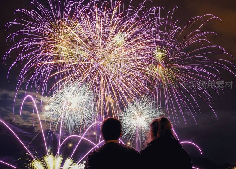 一对情侣并肩站立,静静仰望夜空中绽放的五彩烟花,共享浪漫时刻,画面充满爱意与宁静。