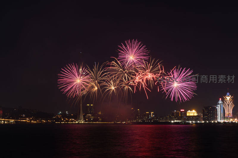 绚丽的烟花在繁华都市的夜空下绽放,映照着灯火通明的高楼大厦和波光粼粼的水面,美不胜收。