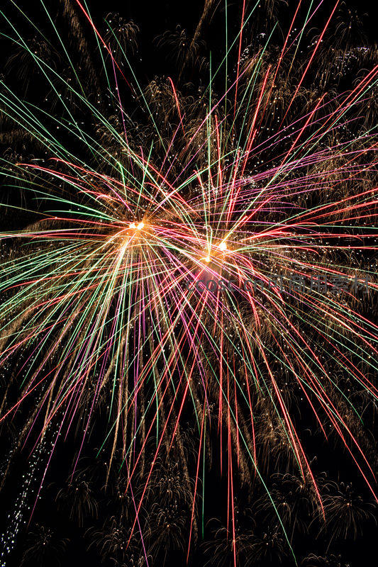 多色烟花在夜幕中炸开,形成放射状的光轨,如同流星雨般倾泻而下,为庆祝之夜增添无尽的活力与光彩。